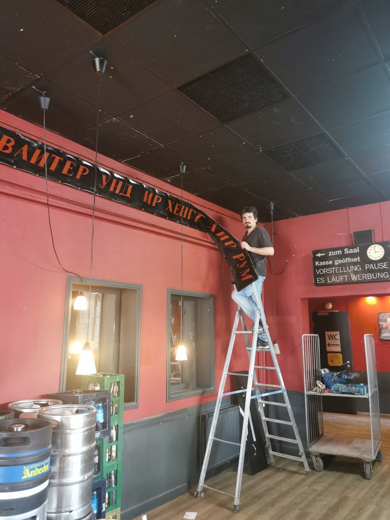 Wusstet ihr eigentlich, was auf dem Banner steht, das von unserem Kollegen Jacques auf dem Foto so fachmännisch abgehangen wird? In kyrillischen Buchstaben, aber auf Deutsch steht dort: