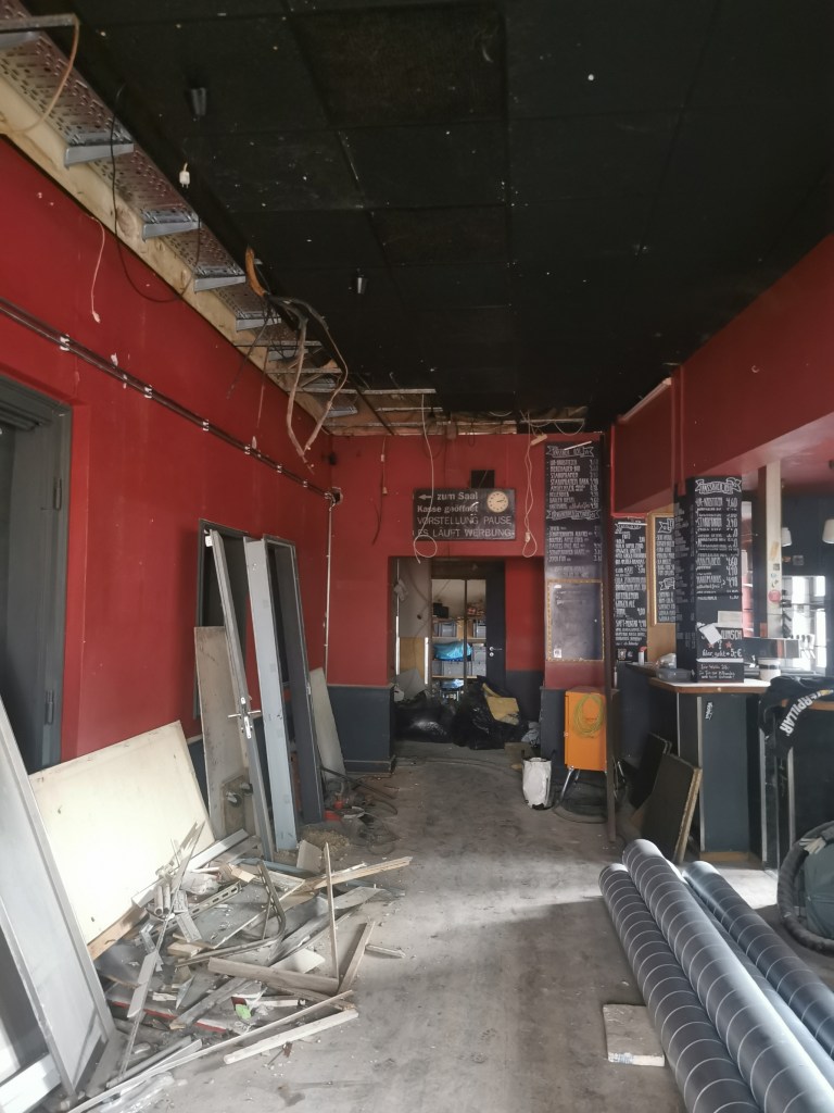 Anfang September haben wir die gesamte Kneipe inklusive Küche ausgeräumt, Tische und Stühle eingelagert, Gläser verpackt und Bierkästen und Fässer verstaut. Wenig später wurde mit dem Abriss des alten Kühlhauses in unserem Gastraum begonnen, inzwischen ist es vollständig abgerissen. Auch das Herrenklo musste bereits weichen, um den Platz für das neue Kühlhaus zu schaffen. Das Klo wird aber natürlich an anderer Stelle wieder aufgebaut.